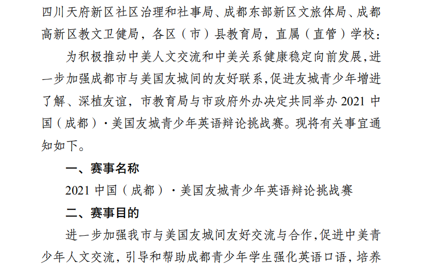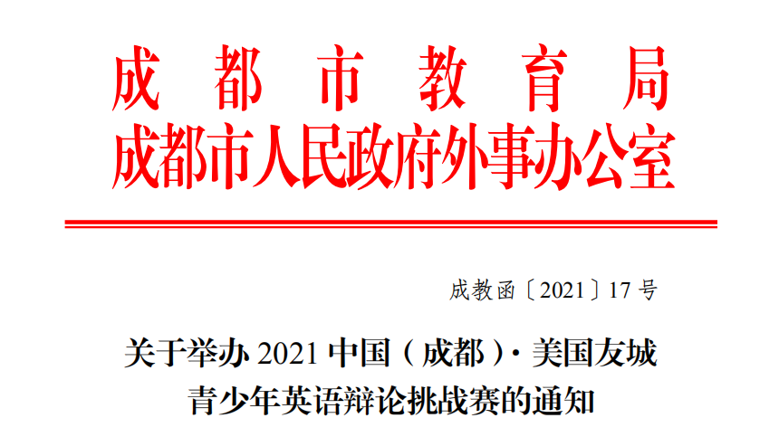 关于举办 2021 中国(成都)·美国友城 青少年英语辩论挑战赛的通知