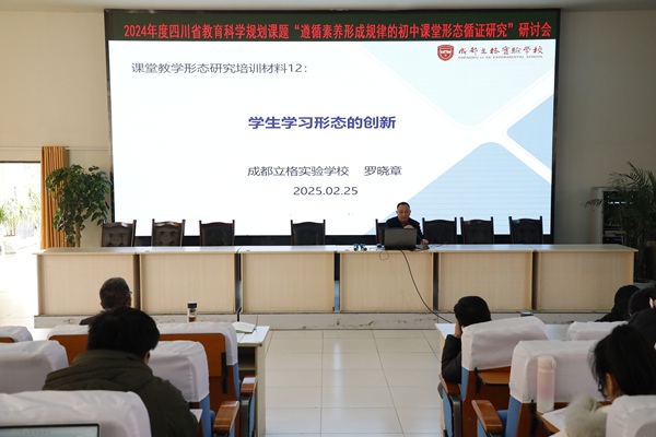 2025年2月25日,成都市双流区立格实验学校承办的2024年度四川省教育科学规划课题“遵循素养形成规律的初中课堂形态循证研究”课题研讨会,在学术厅隆重召开。此次研讨会旨在深入推进课题研究,为探索素养导向的课堂教学新形态提供理论支撑与实践路径。学校罗晓章副校长、教科室文主任、课程与教学处陈主任出席会议,研讨会由课题组长何铁老师主持。